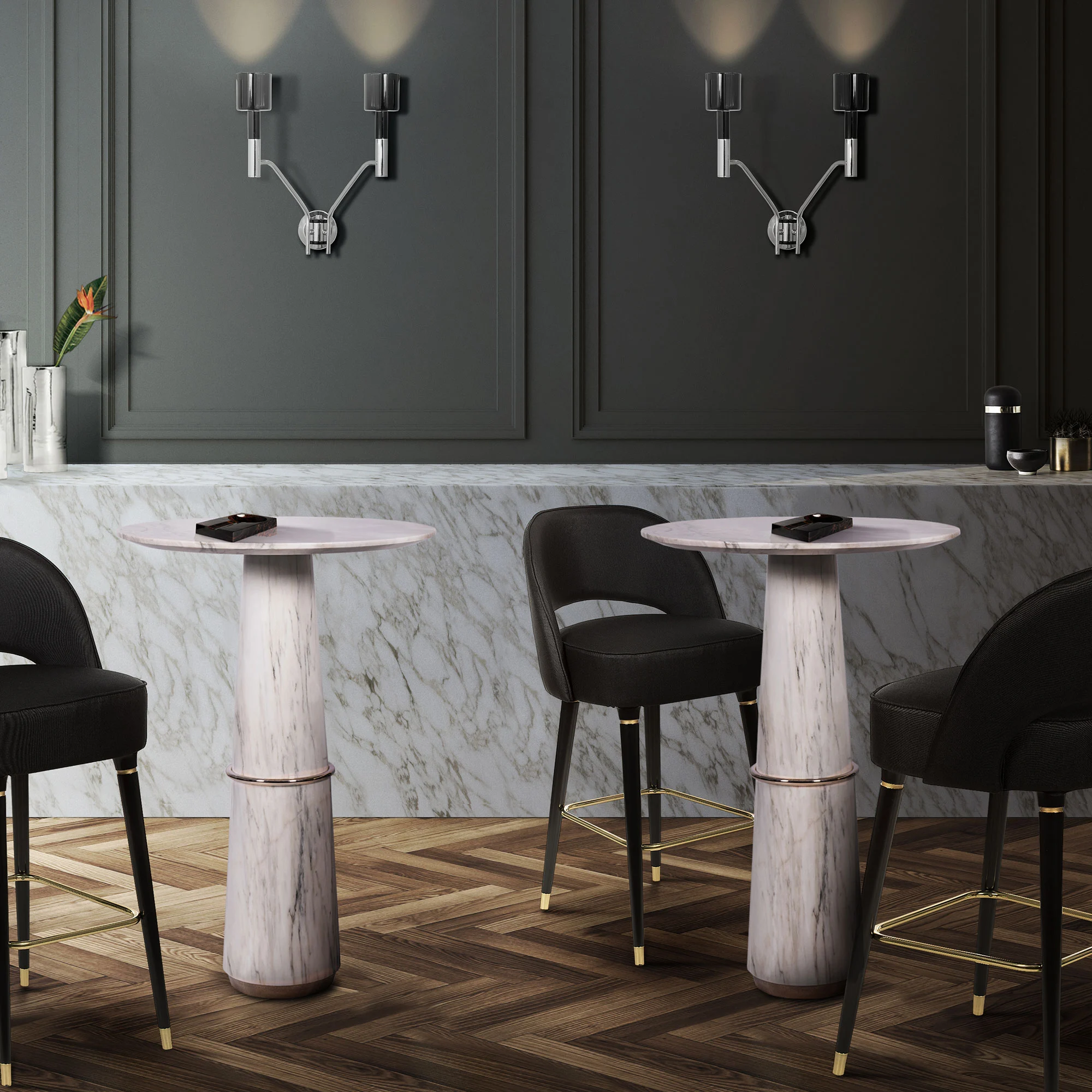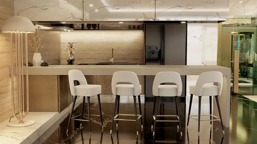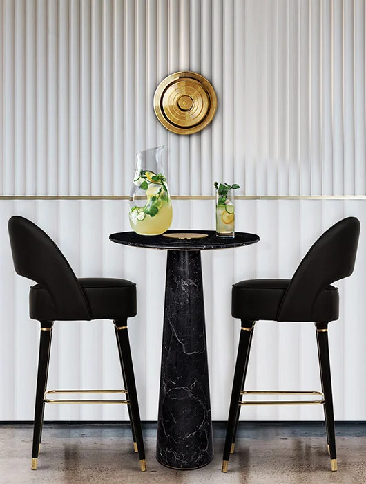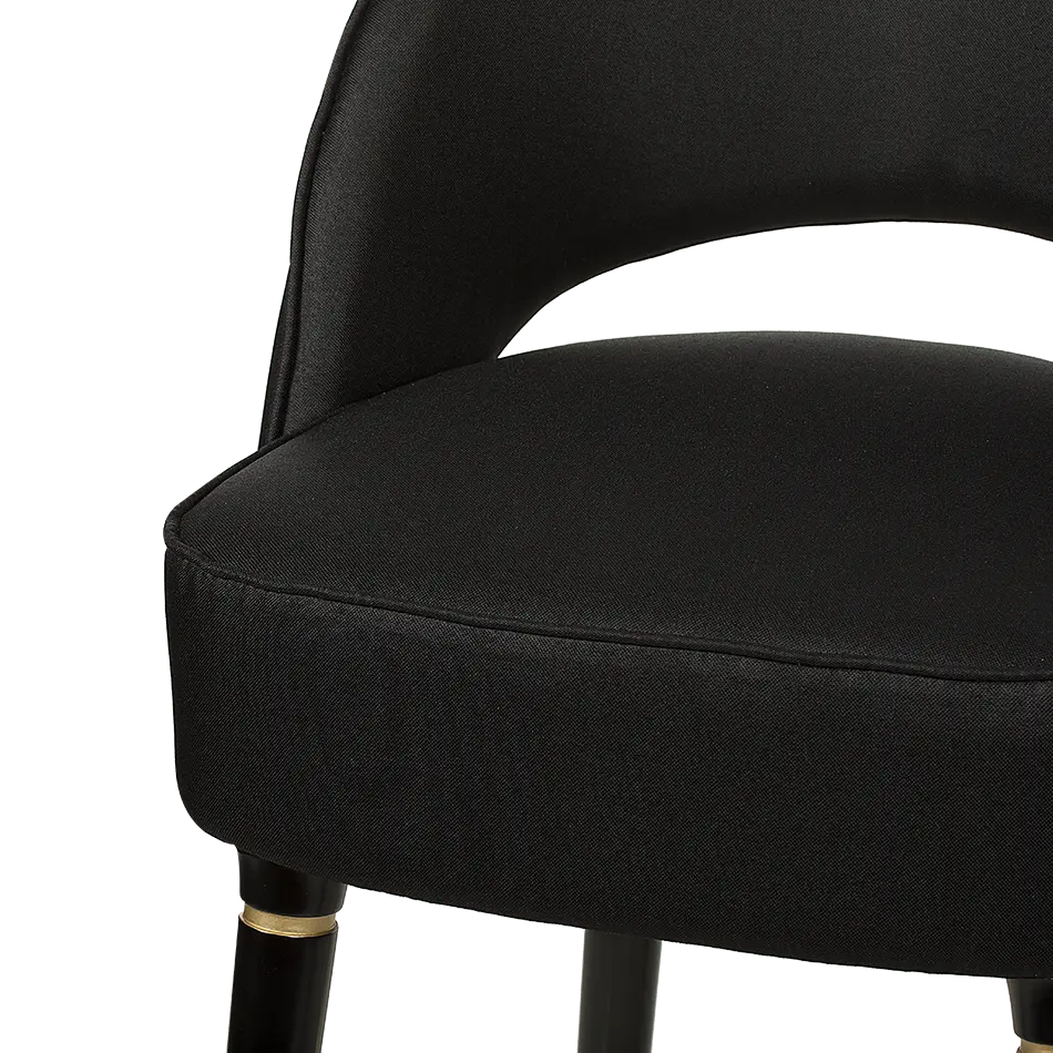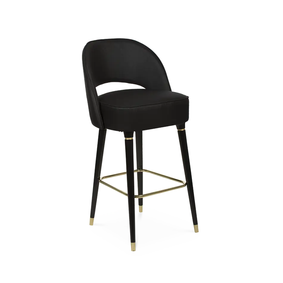 The lusy bar chair exudes mid-century modern charm with its sleek crescent open-back design. Featuring glossy black legs that exude a touch of glamour, the chair is adorned with polished metal accents, particularly on the bottom legs, that add a hint of sophistication. Upholstered in plush suede, this bar chair is the epitome of luxury, making a statement in your home furnishing that is both chic and refined.