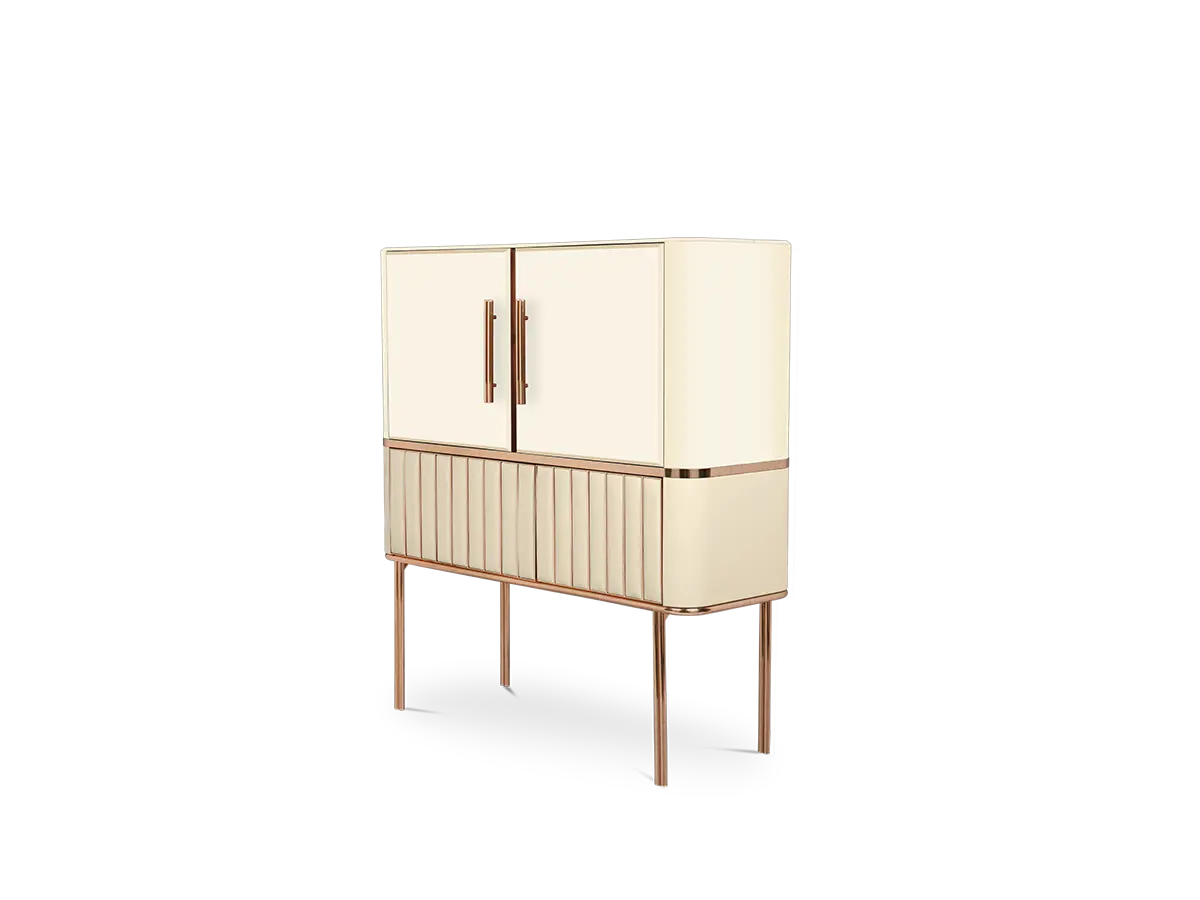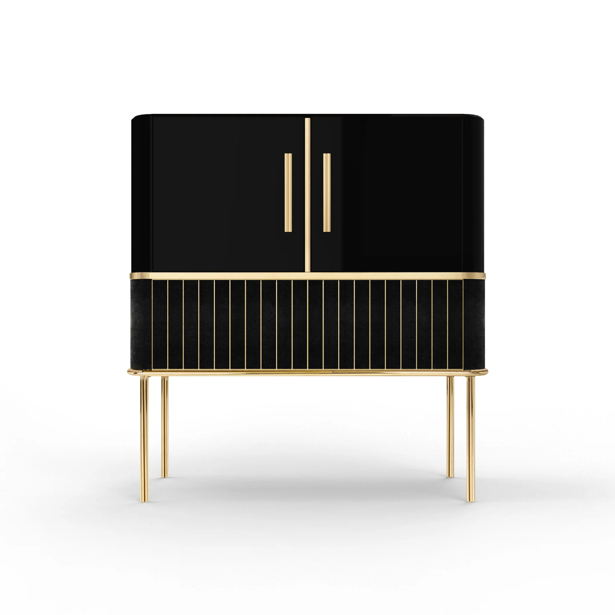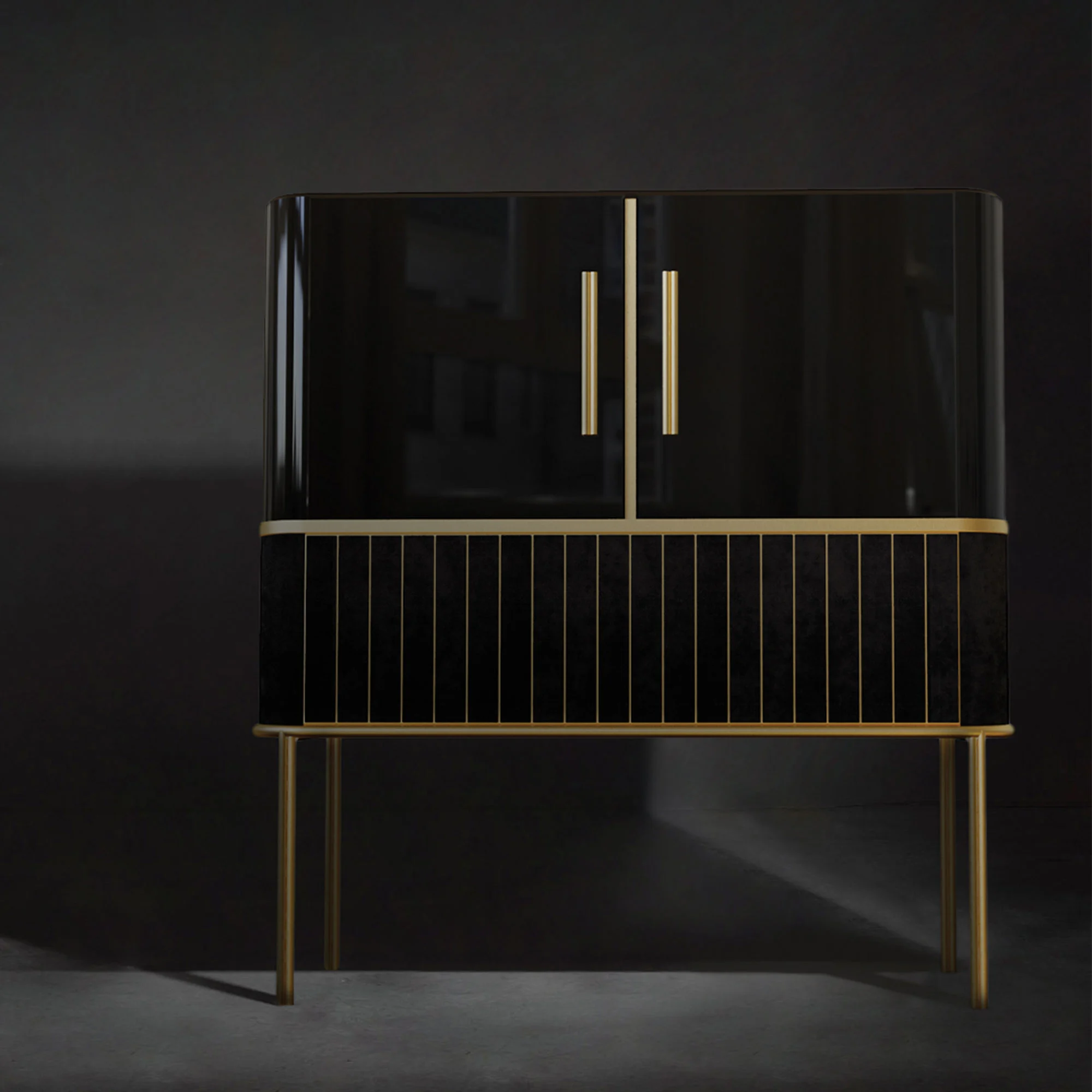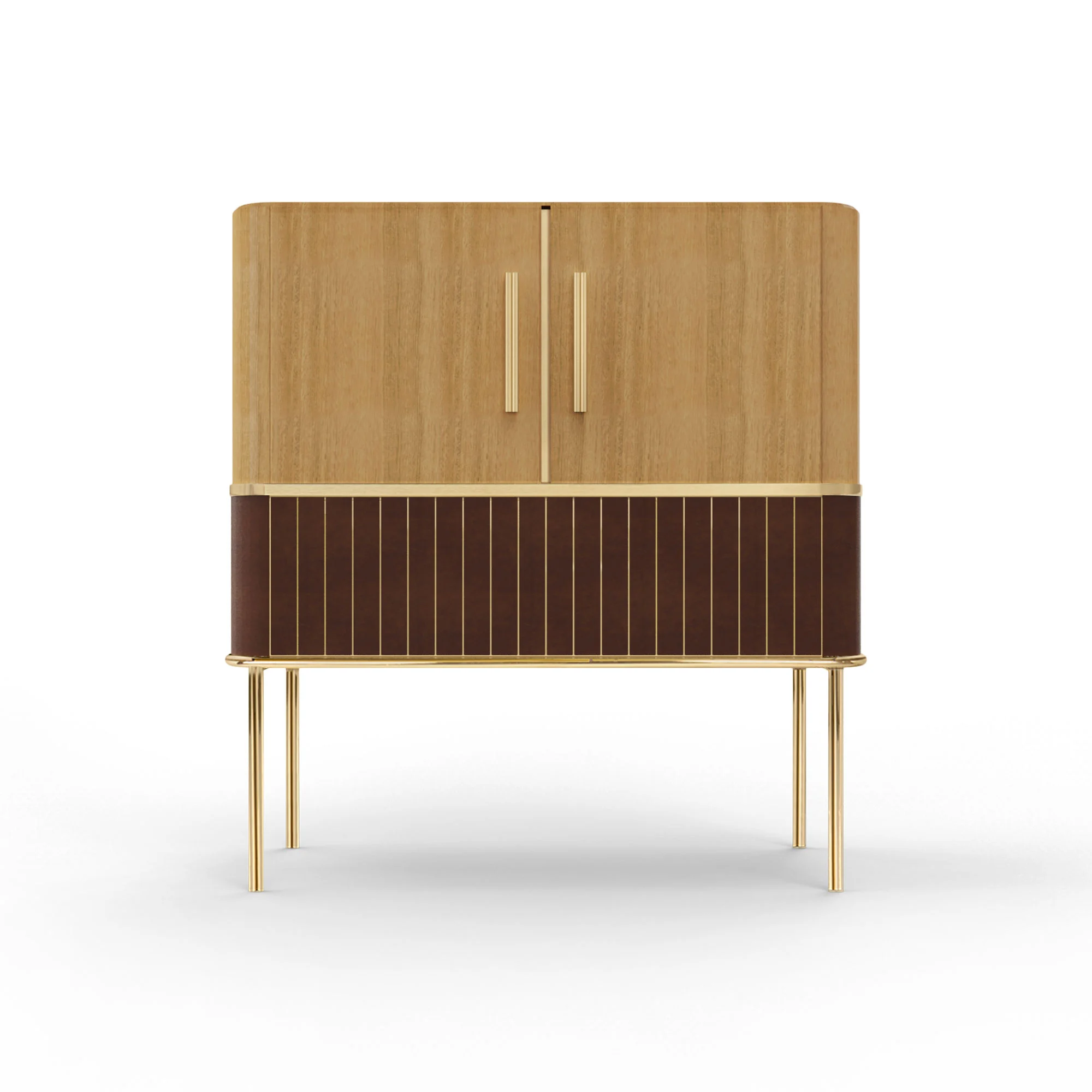 Crafted from wood and accented with two polished metal door handles, this cabinet boasts a unique leather upholstered applique at the bottom and is supported by four slender handmade polished metal legs. Its design versatility allows it to be used as a drinks cabinet, making it an elegant addition to any contemporary home bar or private outhouse. moreover, chesta can be customized to your preferences and is equipped with all the necessary bar hardware.