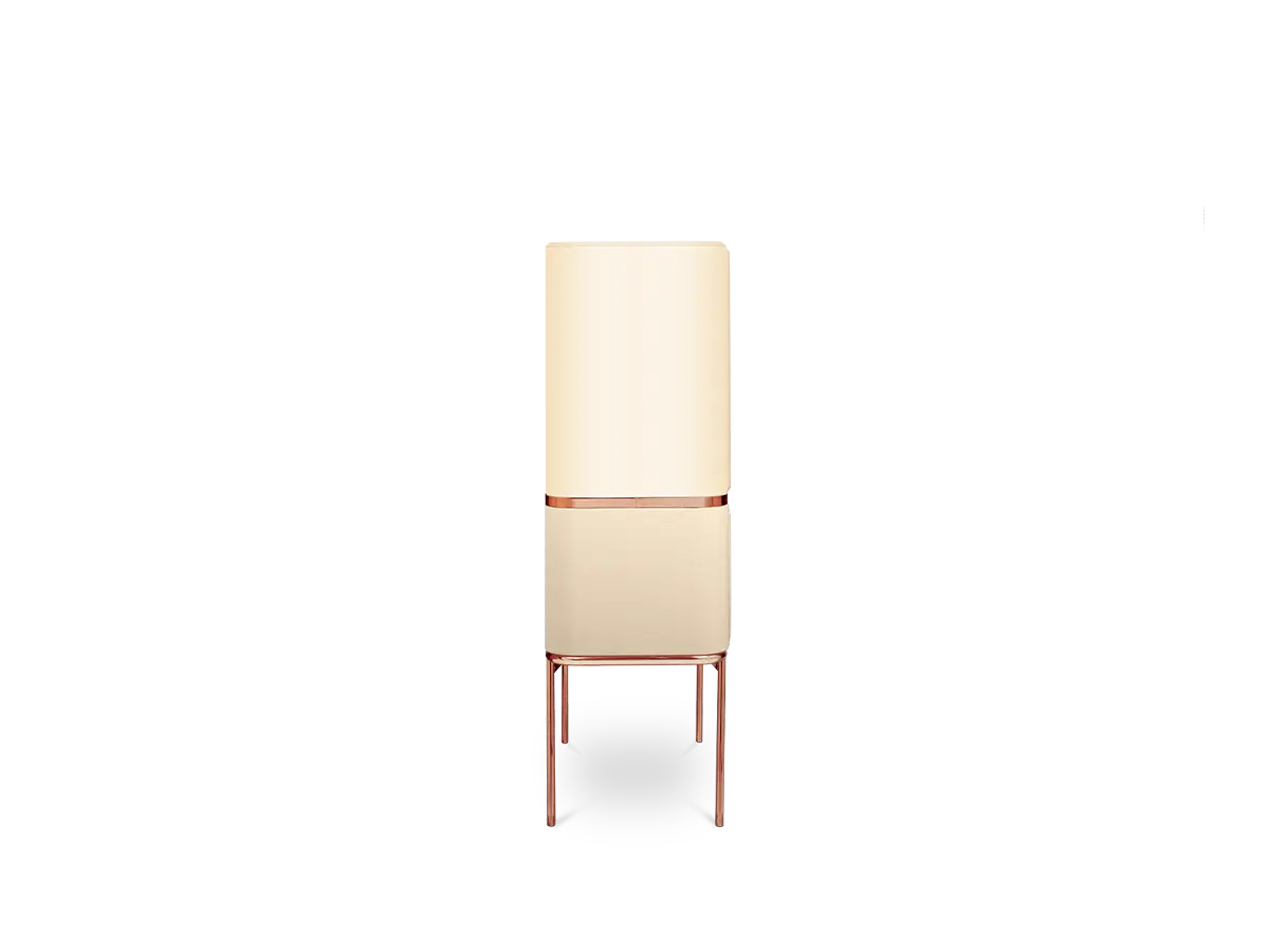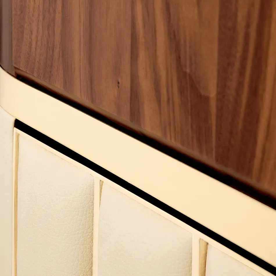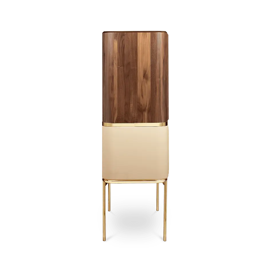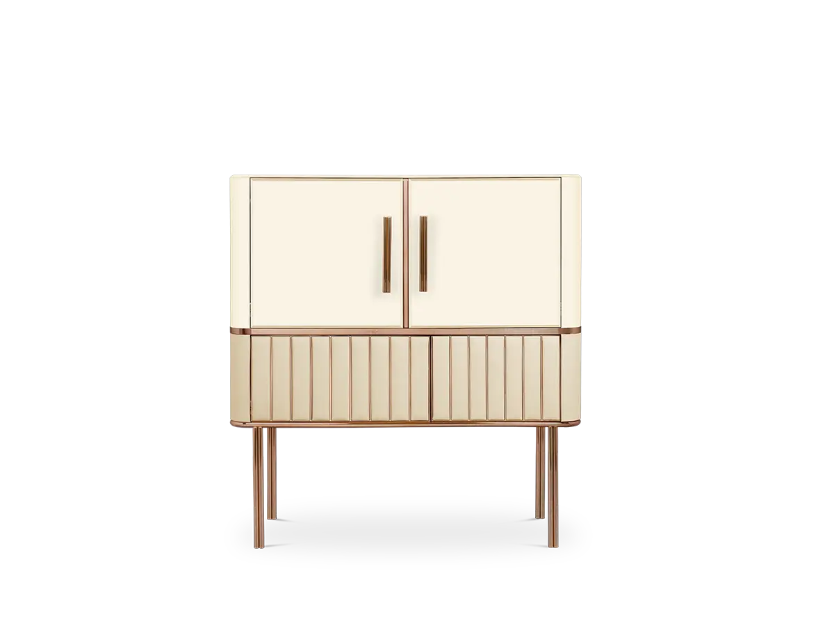 Crafted from wood and accented with two polished metal door handles, this cabinet boasts a unique leather upholstered applique at the bottom and is supported by four slender handmade polished metal legs. Its design versatility allows it to be used as a drinks cabinet, making it an elegant addition to any contemporary home bar or private outhouse. moreover, chesta can be customized to your preferences and is equipped with all the necessary bar hardware.