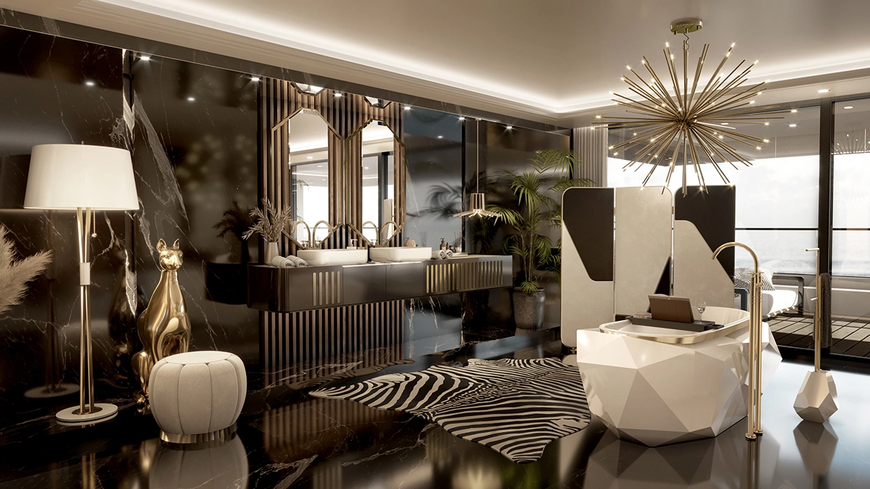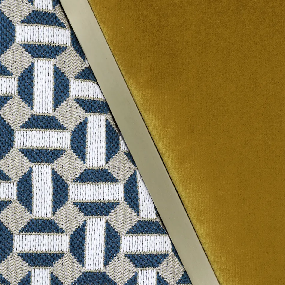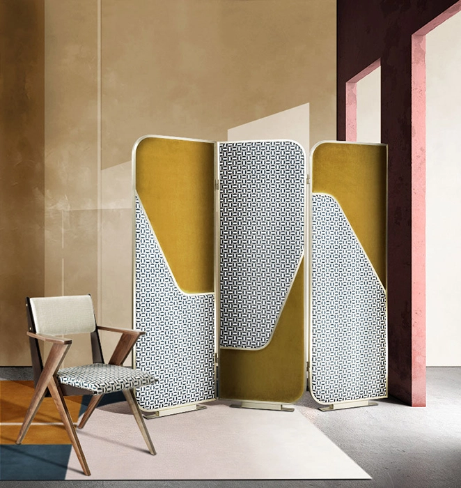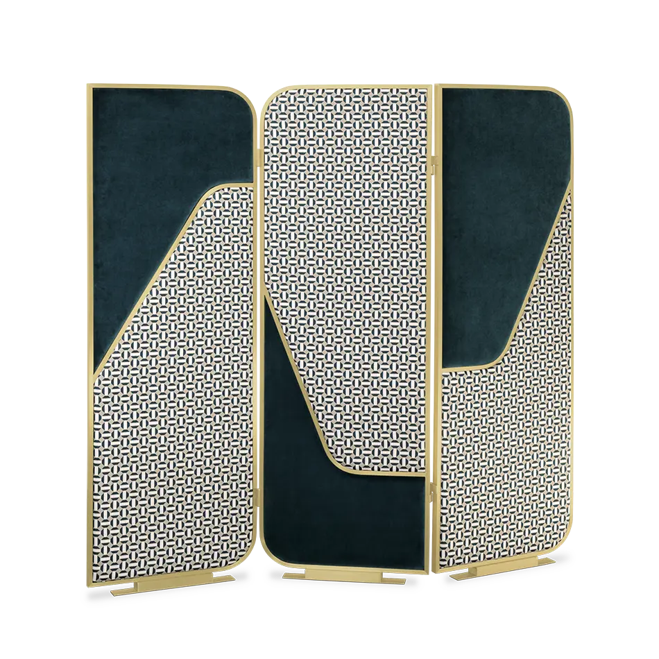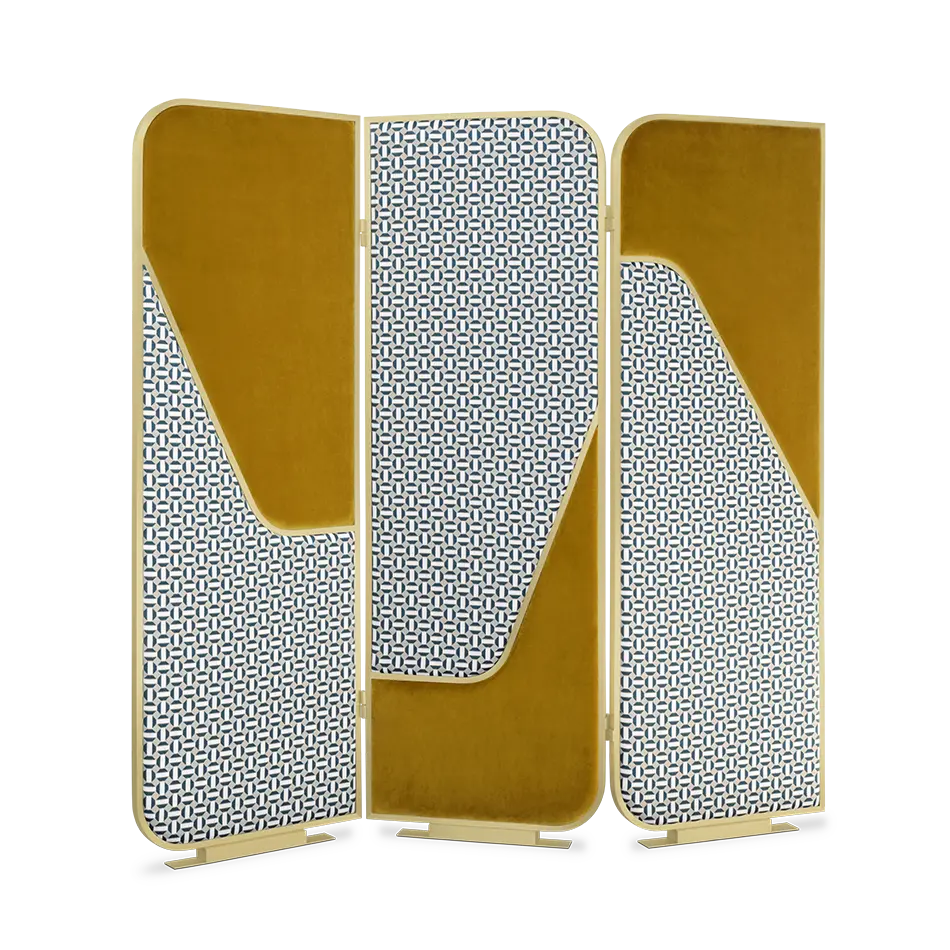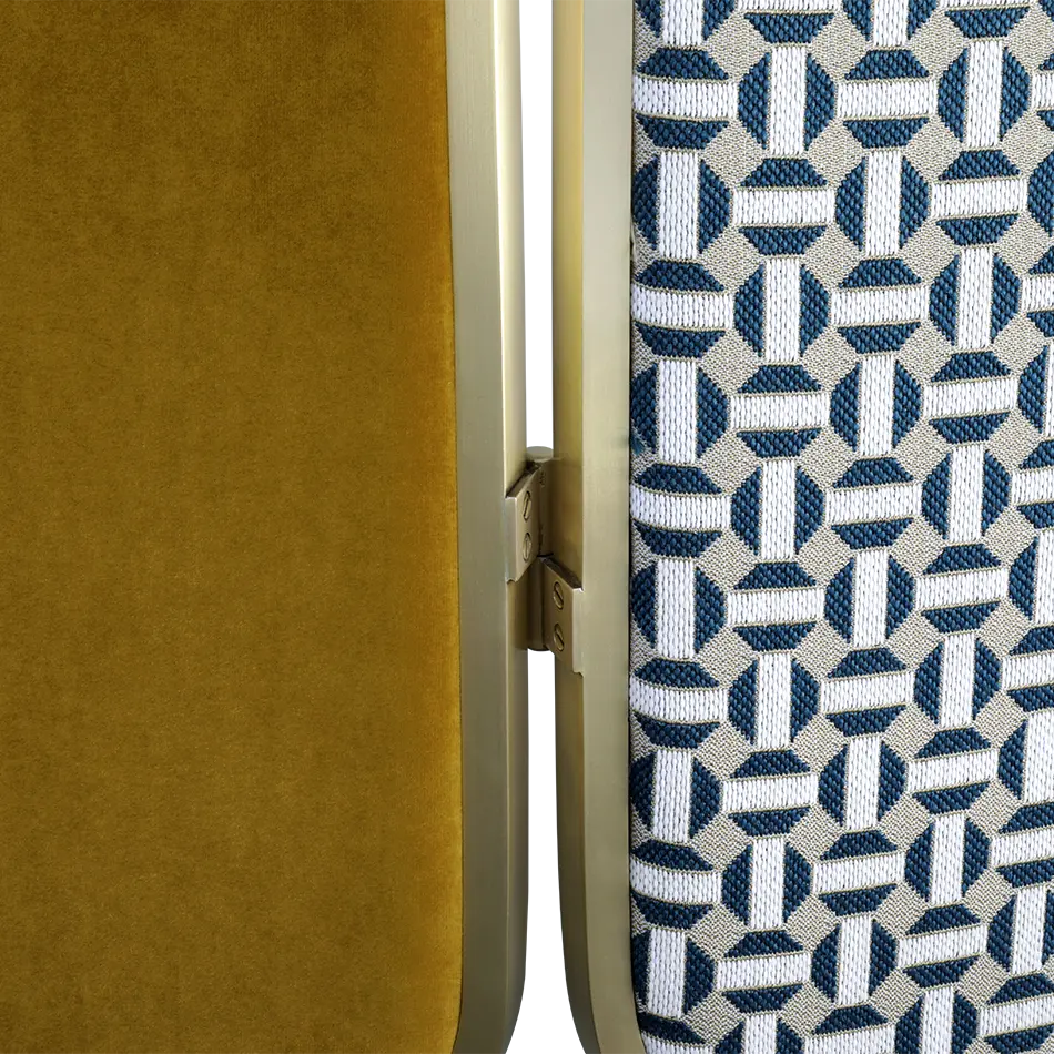 The exquisite metal frame of the Panama screen, with its gracefully curved design, serves as a striking divider between any space of your home. It forms a sophisticated interplay with the upholstery, which can be either in a rich yellow or peacock velvet, complemented by a fabric that evokes a 1950s aesthetic.