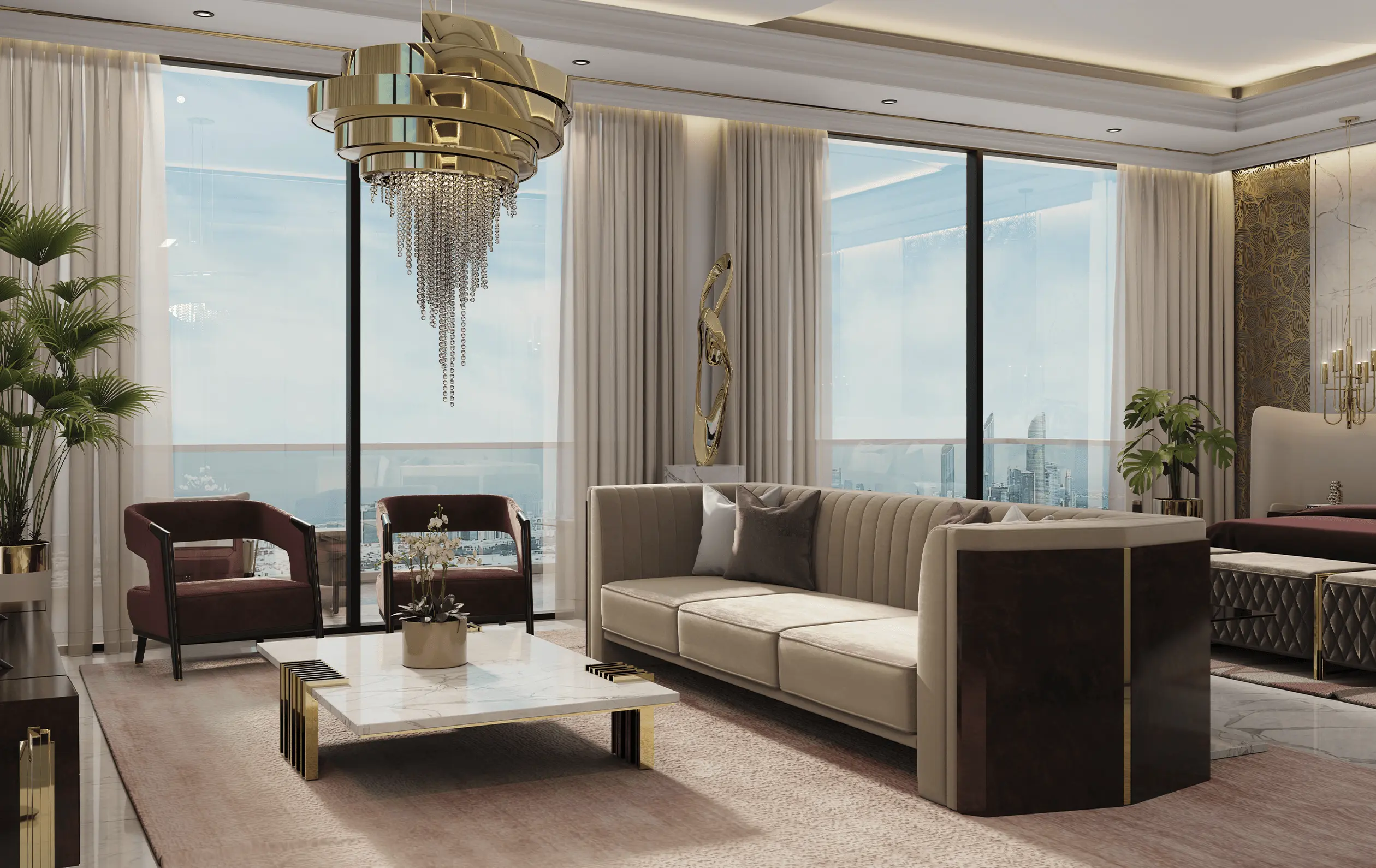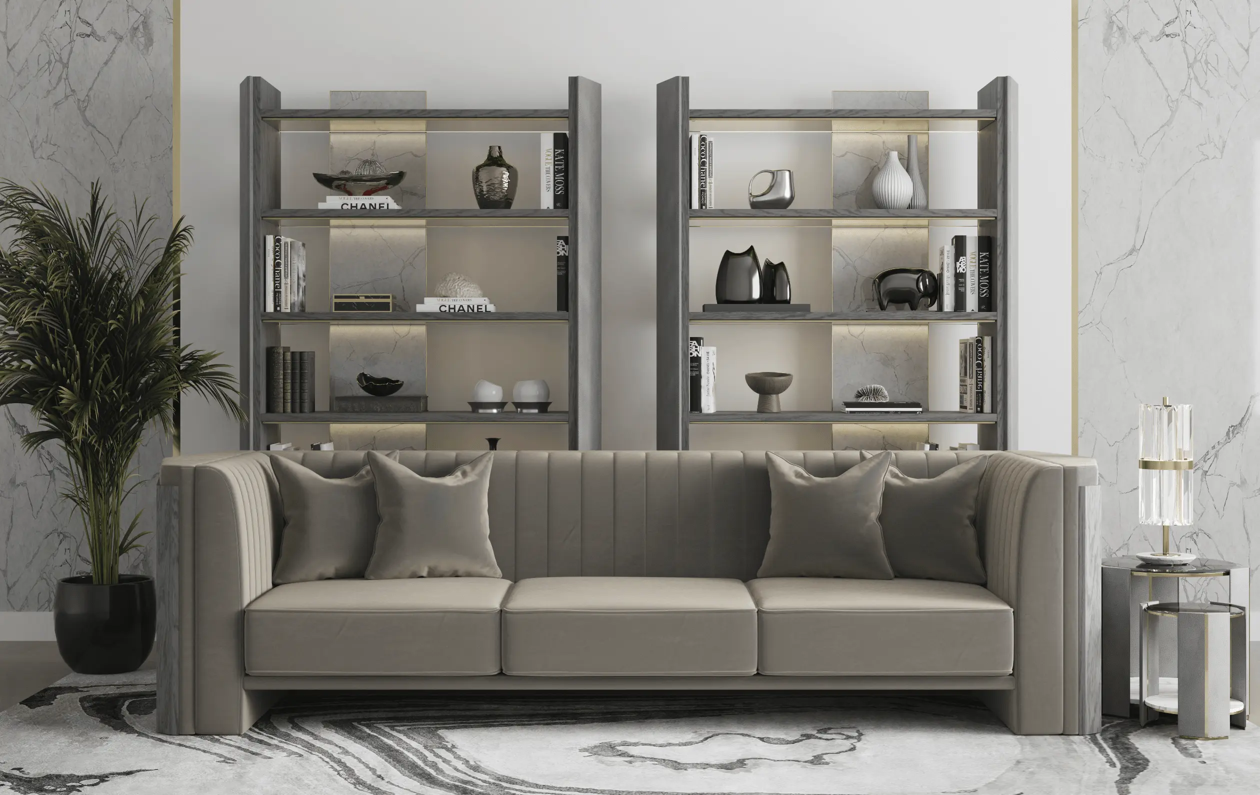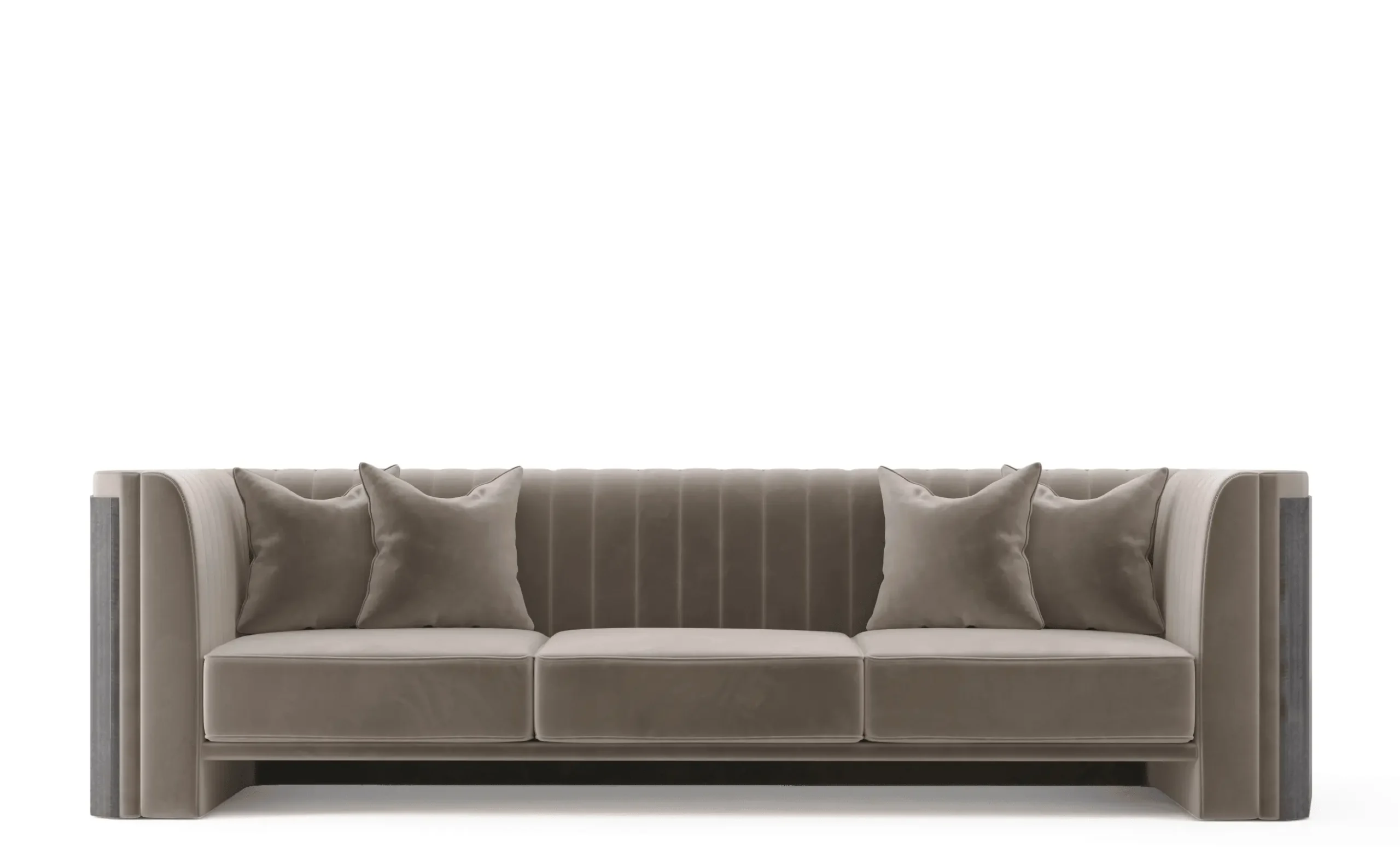 The Herrera sofa embodies the epitome of comfort and luxury in a singular masterpiece. With its smooth brown velvet upholstery, this linear sofa accentuates the classical lines and geometric details that define the distinctive Herrera family design. As the focal point of any living room, the Herrera sofa is sure to evoke envy with its opulent presence. Its unmatched style and unparalleled comfort make it a true statement piece that exudes sophistication in any interior setting.